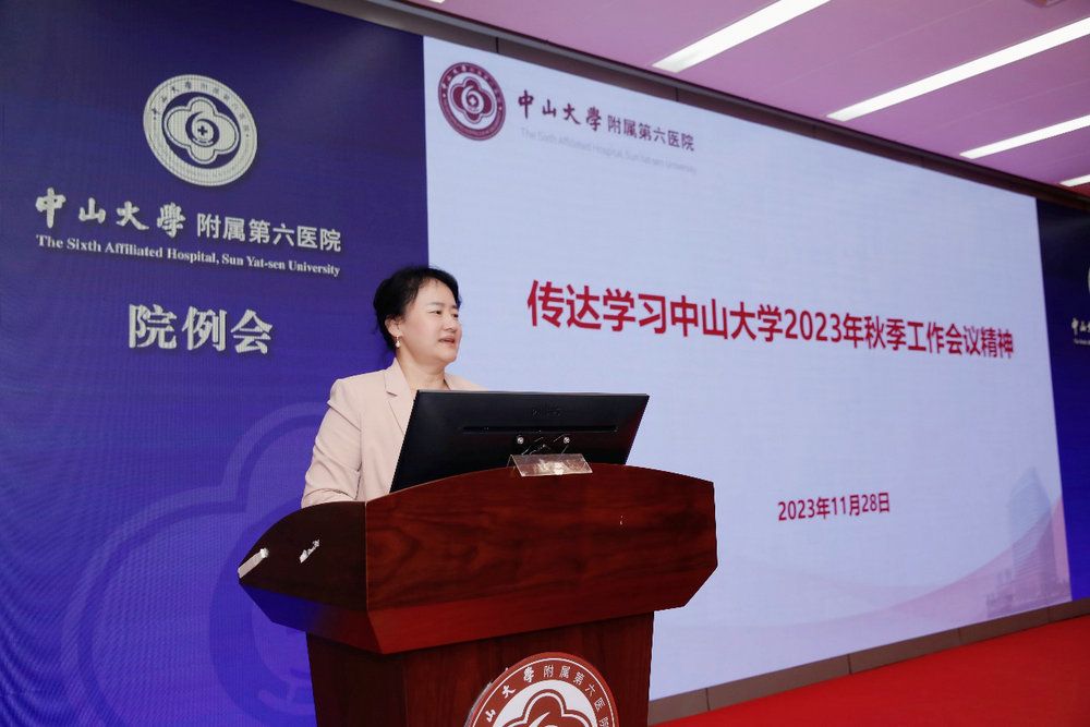 會上,附屬第六醫院黨委書記李漢榮介紹了為期2天的學校2023年秋季工作會議的基本情況,重點傳達了校黨委書記陳春聲的總結報告精神。李漢榮書記還傳達了校黨委副書記、紀委書記、國家監委駐中山大學監察專員刁振強所作的警示教育專題報告精神。李漢榮書記指出,全院上下要深入學習領會學校秋季工作會議精神,進一步統一思想認識,圍繞推進科技自立自強、人才自主培養,踐行中大醫科的責任擔當,找準定位,搶抓機遇,發揮優勢,主動融入中大高質量內涵式發展和粵港澳大灣區醫療衛生領域的戰略布局。