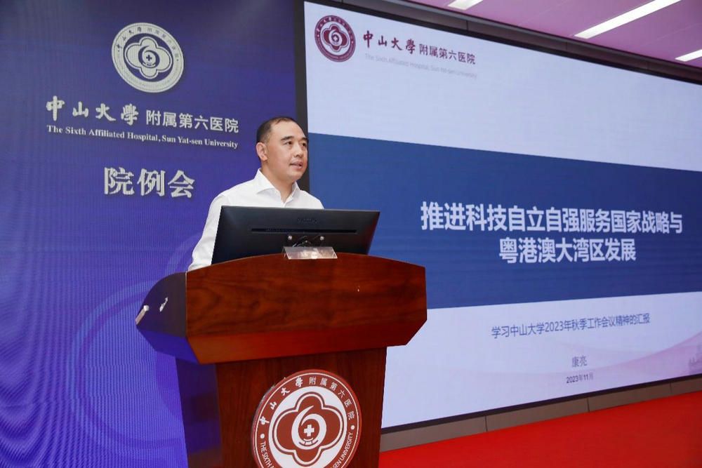 會上,附屬第六醫院副院長康亮重點傳達了高松校長以“推進科技自立自強,服務國家戰略與粵港澳大灣區發展”為主題的大會報告,報告指明了學校科研工作高質量內涵式發展的機遇、路徑、理念與措施,強調了學校堅持教育、科技、人才一體統籌推進,做到“立足灣區與面向世界、學術前沿與學科交叉、目標導向與自由探索、科學價值與應用價值、科研創新與制度創新”五個結合,努力為全面建設社會主義現代化國家提供重要支撐。康亮副院長結合醫院科研工作提出,醫院要進一步提高站位,積極響應國家和大學的號召,主動與兄弟單位合作,發揮優勢特色,落實重大項目建設,助力粵港澳大灣區協同發展。