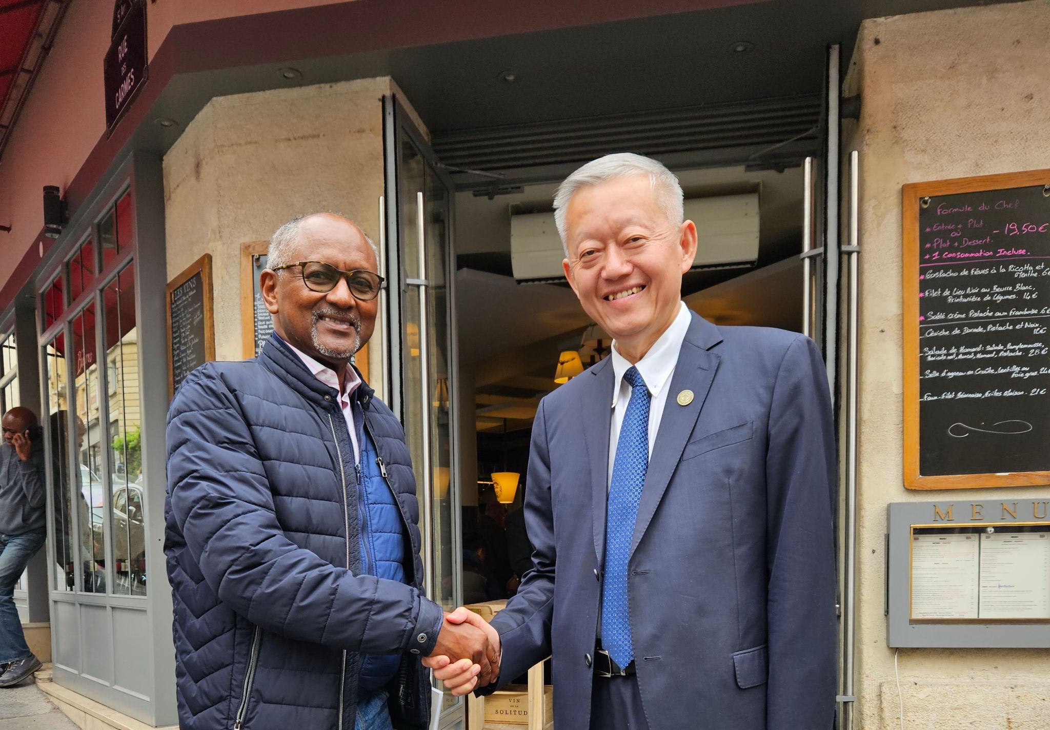 在法國期間,代表團還拜訪了聯合國教科文組織非洲優先與對外關系助理總干事Firmin Edouard Matoko先生和杜越教授。Matoko先生高度評價了中山大學的百年發展成就,尤其是長期參與和支持聯合國教科文組織的活動,并對中山大學百年校慶表示祝賀。雙方達成共識,將進一步發掘合作潛力,建立更加緊密的合作伙伴關系。在國際語言人才服務、文化遺產保護和旅游管理、海洋研究等領域加強合作。雙方就國際組織人才培養、中非教育合作等面臨的挑戰交換了意見。杜越教授服務于聯合國教科文組織超過四十年,為深化中國與教科文組織的合作做出了巨大的貢獻,得到了國際和國內各方面高度認可。陳春聲書記為杜越教授頒發了中山大學顧問教授聘書,希望借鑒杜越教授豐富的國際組織多邊外交經驗,推動中大的國際組織人才培養、加強各相關學科與聯合國系統的合作伙伴關系。