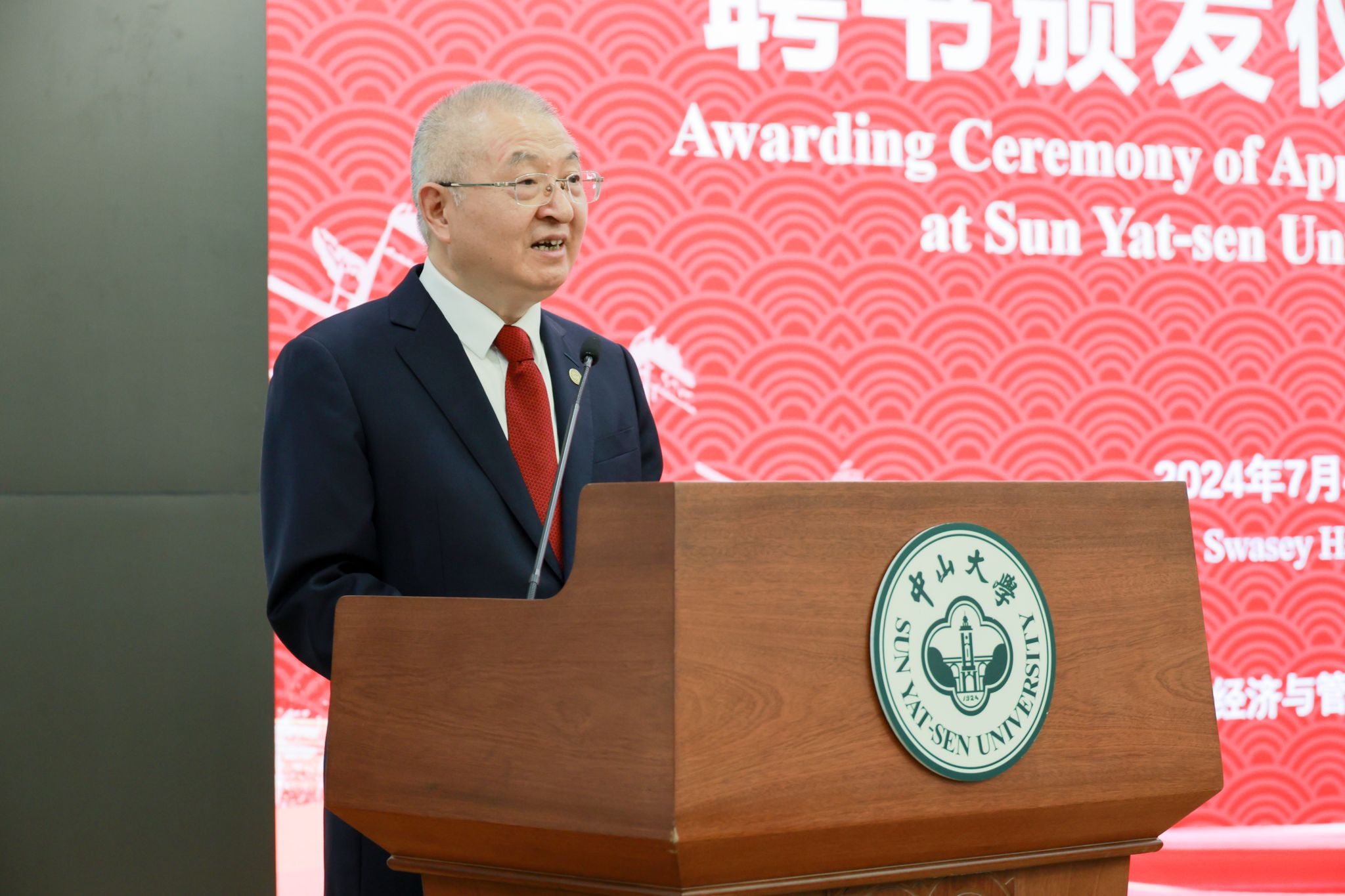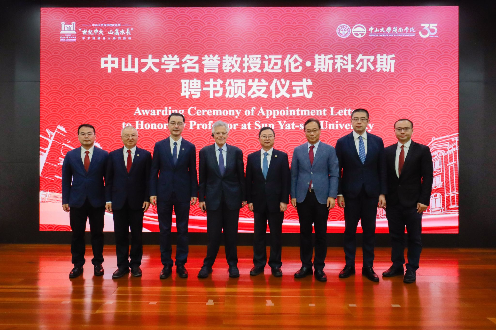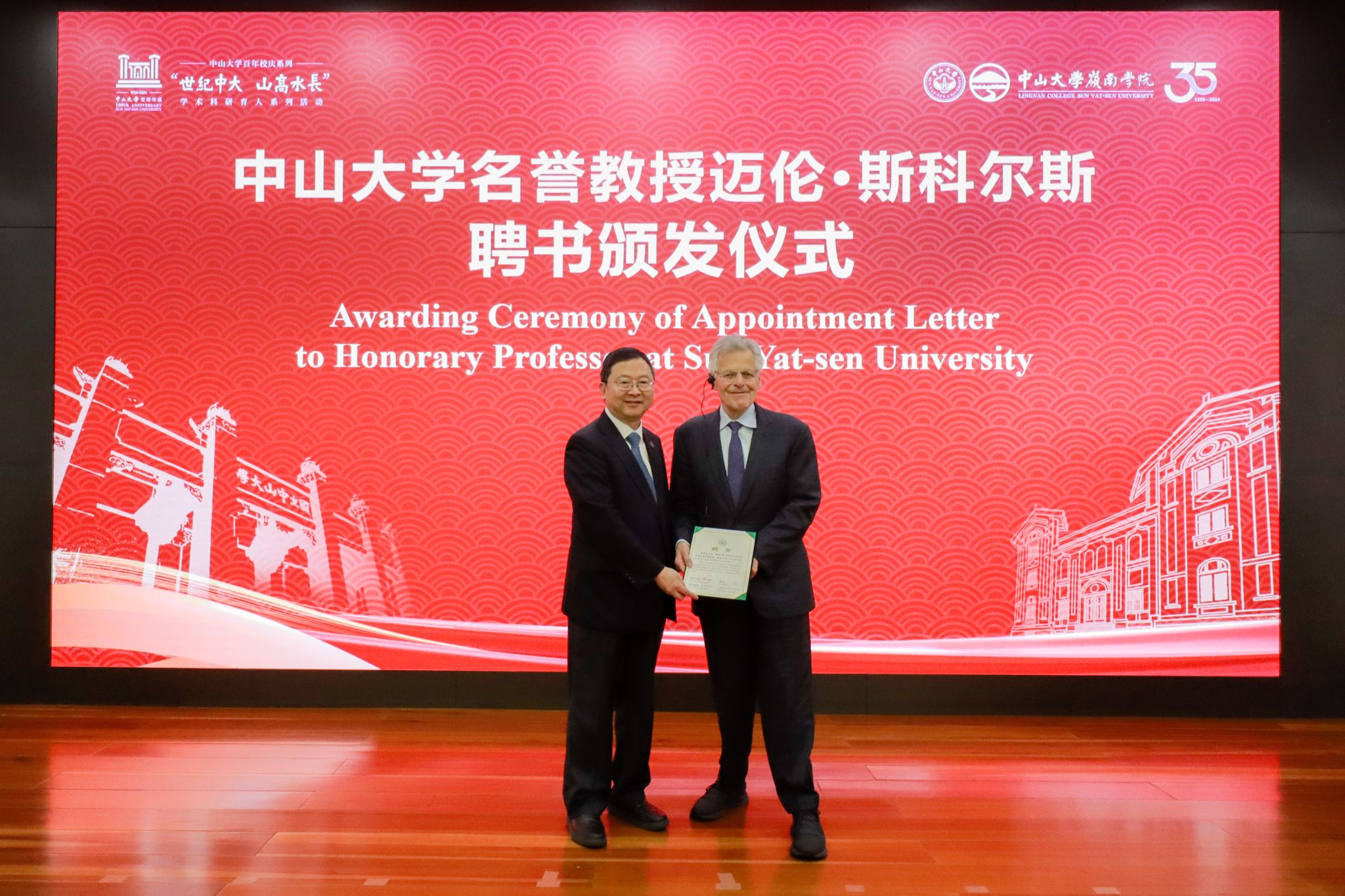 高松校長向邁倫·斯科爾斯教授頒發中山大學名譽教授聘書