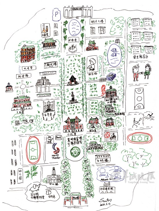 羊城晚報訊 一張Q版的中山大學南校區地圖近日在網上悄然流傳。地圖中,中大正門和北門隔空相望,中間小禮堂、永芳堂等中大標志性建筑全部被作者簡練、童真的筆觸收歸畫中。令人大跌眼鏡的是,這幅被網友齊齊夸“有愛”的地圖,并非出自學生之手,而是中大理工學院一名女老師的信手涂鴉之作。 一望無垠的大草坪、孫山中銅...