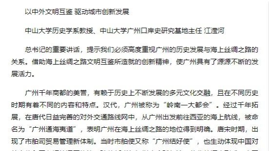 4月7日,習近平總書記在廣州同法國總統馬克龍舉行非正式會晤時指出,了解今天的中國,要從了解中國的歷史開始。廣州是中國民主革命的策源地和中國改革開放的排頭兵。1000多年前,廣州就是海上絲綢之路的一個起點。100多年前,就是在這里打開了近現代中國進步的大門。40多年前,也是在這里首先蹚出來一條經濟特區建設之路...