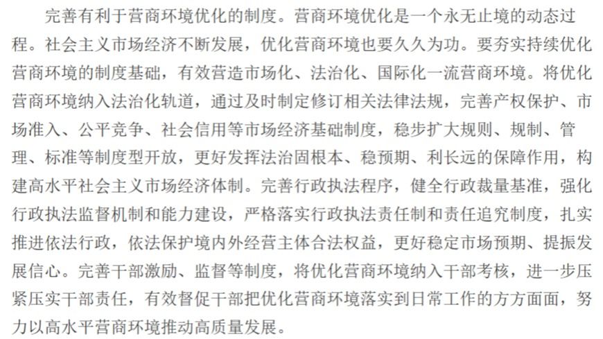 優化營商環境是全面深化改革、實現高質量發展的必然選擇,也是推進國家治理體系和治理能力現代化的重要任務。習近平總書記強調:“要繼續深化改革,堅持‘兩個毫不動搖’,優化營商環境。”營商環境沒有最好,只有更好。持續優化營商環境是一項系統工程,涉及宏觀調控、市場監管、公共服務等多領域、多層次的制度安排,...