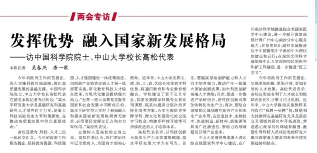 今年的政府工作報告提出,深入實施科教興國戰略,強化高質量發展的基礎支撐。中國科學院院士、中山大學校長高松代表在接受本報記者專訪時說:"高水平研究型大學是基礎研究和基礎研究人才培養的主力軍,是重大科技突破的生力軍和策源地,在推動高質量發展中擔負重要使命。"高校是教育、科技、人才三位一體的交匯點。今年...