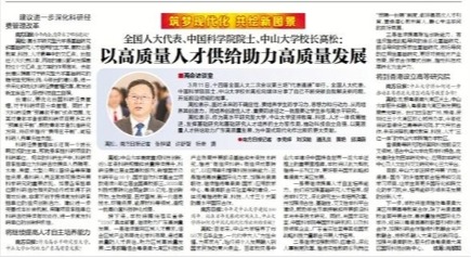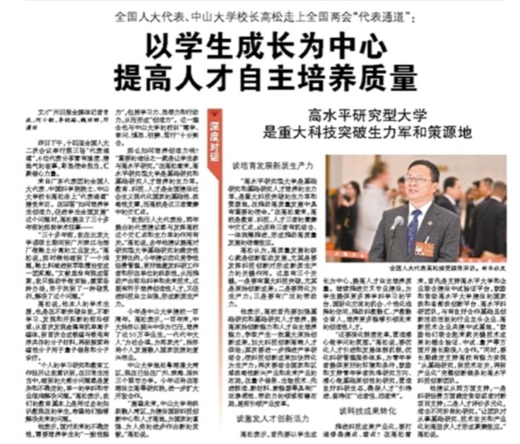 高質(zhì)量發(fā)展,是今年全國兩會最熱的關(guān)鍵詞之一。3月9日,全國人大代表、中國科學(xué)院院士、中山大學(xué)校長高松在接受羊城晚報記者采訪時表示,高校要在涉及國家重大戰(zhàn)略領(lǐng)域,尤其是人才培養(yǎng)、科技創(chuàng)新和社會服務(wù)方面作出應(yīng)有貢獻(xiàn),推動國家、地區(qū)實現(xiàn)高質(zhì)量發(fā)展。“近年來,中山大學(xué)開啟了建設(shè)鮮明中國特色、顯著中大風(fēng)格、...