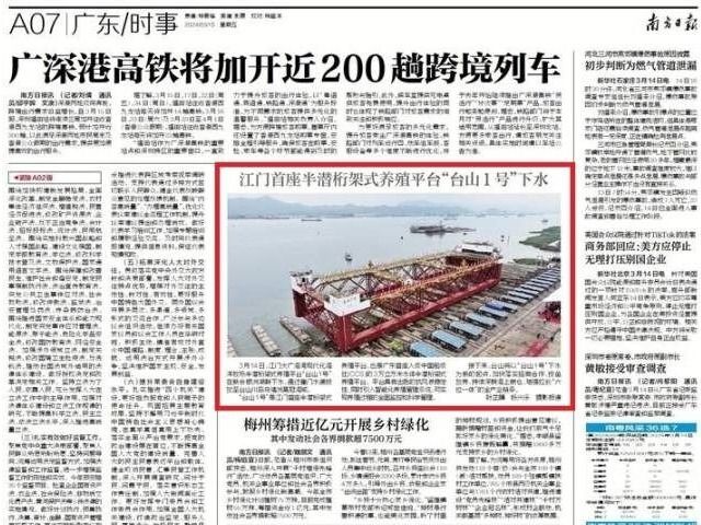 3月14日,江門大廣海灣現代化海洋牧場半潛桁架式養殖平臺“臺山1號”在新會銀洲湖畔下水,通過崖門水道投放至臺山川島烏豬洲高冠海域。“臺山1號”由臺山海洋發展集團有限公司聯合中國水產科學院南海水產研究所、中山大學海洋科學學院、珠海德賽海洋漁業科技有限公司等單位共同建造,是江門首座半潛桁架式養殖平臺,也是...
