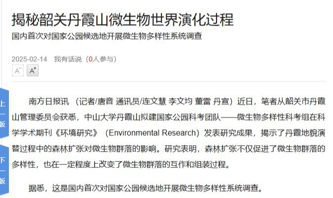 近日,筆者從韶關市丹霞山管理委員會獲悉,中山大學丹霞山擬建國家公園科考團隊——微生物多樣性科考組在科學學術期刊《環境研究》(Environmental Research)發表研究成果,揭示了丹霞地貌演替過程中的森林擴張對微生物群落的影響。研究表明,森林擴張不僅促進了微生物群落的多樣性,也在一定程度上改變了微生物群落的...