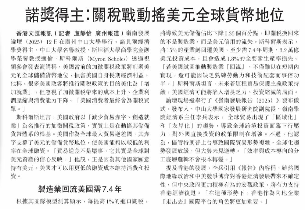 • 【香港文匯報】諾獎得主:關稅戰動搖美元全球貨幣地位