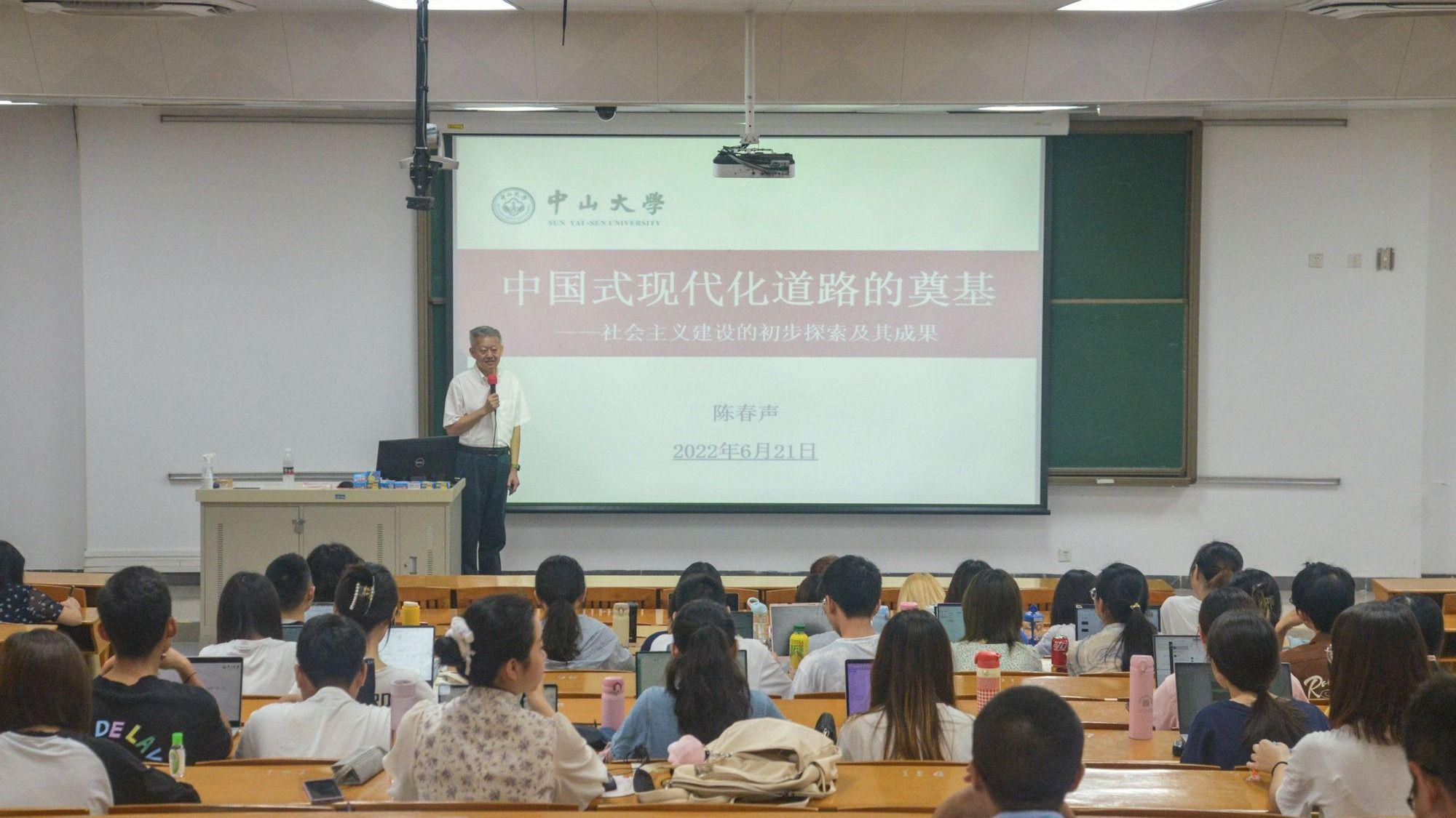 中大新聞網廣州6月25日電(記者李建平)6月21日,校黨委書記陳春聲在廣州校區東校園教學樓B101教室以“中國式現代化道路的奠基——社會主義建設的初步探索及成果”為主題,為來自傳播與設計學院和心理學系的85名2020級本科生講授思想政治理論課。