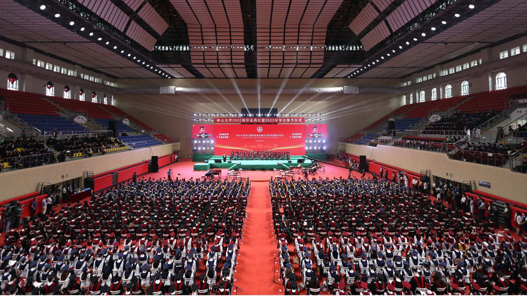 中大新聞網廣州6月29日電(記者邱清萌、彭心如、李建平)“小軒窗,大學堂,再回首綠瓦紅墻。”6月28日上午,中山大學2022屆畢業典禮暨2022年學位授予儀式在廣州校區南校園新體育館隆重舉行。來自中大三校區五校園的近3000名本科、碩士、博士學生代表齊聚一堂,中山大學黨委書記陳春聲,中國科學院院士、校長高松,中國科學院院士陳小明、張培震、戴永久,校學位評定委員會委員等出席典禮。