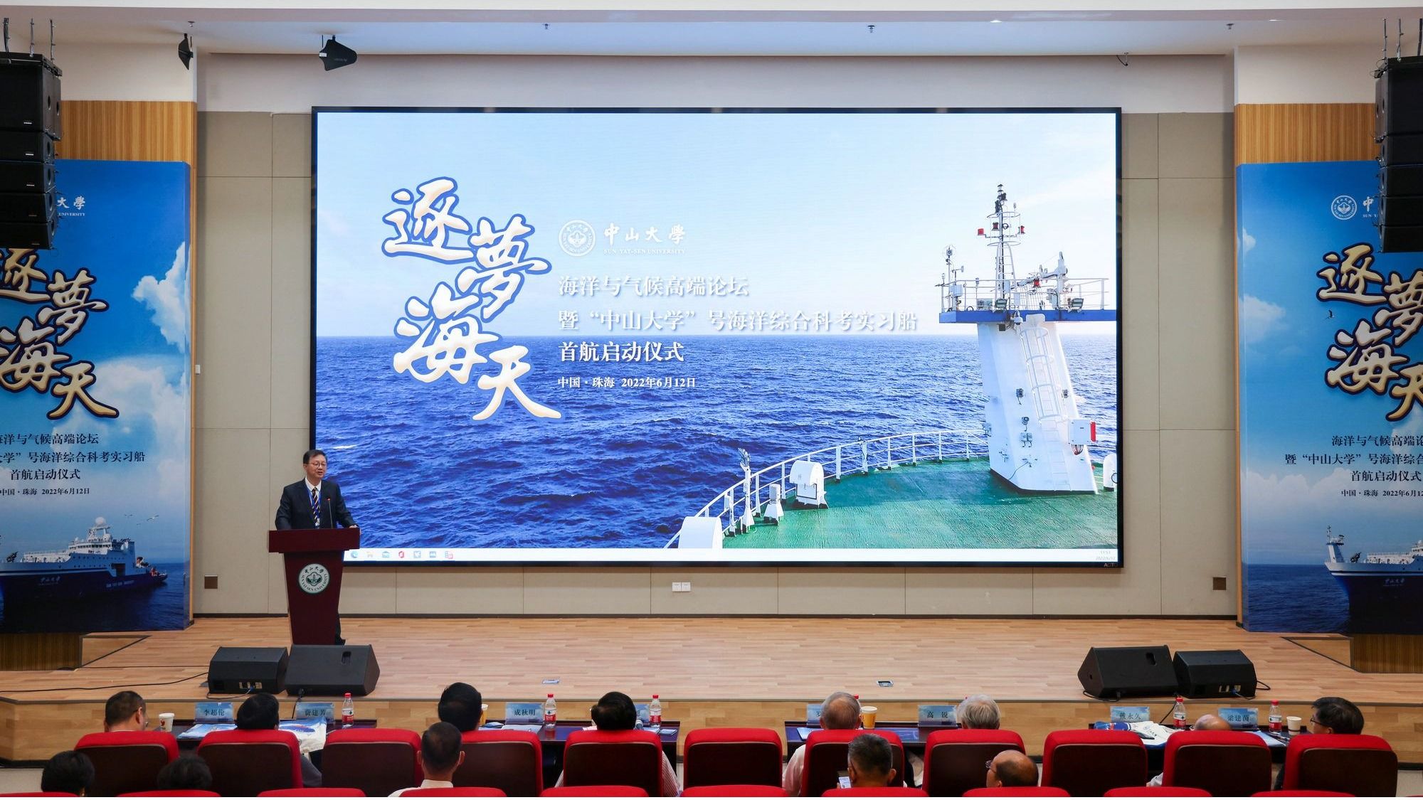 中大新聞網廣州6月16日電(通訊員葉瑋茵、朱曉丹)6月12日上午,來自國內多家單位的涉海領域專家學者齊聚中山大學珠海校區海琴2號樓B102報告廳,舉行“逐夢海天:海洋與氣候高端論壇”暨“中山大學”號海洋綜合科考實習船首航啟動儀式。中國科學院和中國工程院的9位院士,來自國內涉海洋學科高校、科研機構的17名專家出席論壇。