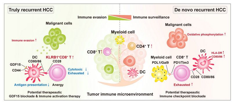 Next, researchers found significant differences in TIME between true and de novo HCC recurrences. The TIME of truly recurrent HCCs was characterized by reduced frequency and function of dendritic cells (DC) and increased abundance of KLRB1+CD8+ T cells with memory phenotype and low cytotoxicity. In contrast, higher proportions of DCs and enrichment in cytotoxic and exhausted CD8+T cells were found in the TIME of de novo recurrent HCCs. By Monocle, the dynamic immune states and cell transition trajectories of tumor-specific CD8+T cells in the two recurrent HCC types were inferred. It showed that most effector CD8+T cells in de novo recurrent HCCs could transit to exhausted CD8+T cells, while a significant part of effector CD8+T cells in truly recurrent HCCs transit to KLRB1+CD8+T cells with immunosuppressive function and low cytotoxicity. Further, researchers tried to uncover the reasons for the differences in microenvironment between these two types of recurrent HCCs. HCC cells in truly recurrent HCCs had a higher immune escape ability than those in de novo recurrent HCCs. AND in-depth analysis showed that the former highly expressed the immunosuppressive molecule GDF15, which may have dampened antigen presentation of DC through the GDF15-CD44 axis and inhibited the antitumor activity of CD8+T cells. Besides, the high expression level of GDF15 was closely related to the recurrence of primary or recurrent HCC. In addition, the strong interactions between myeloid cells and CD8+T cells in de novo recurrent HCCs induced exhausted CD8+T cells and mediated immunosuppressive microenvironment through PD1/PD-L1 and Galectin9/Tim3 axis. These results suggest that true and de novo HCC recurrences may require different immunotherapy strategies. Truly recurrent HCCs may require therapy to stimulate the release of tumor antigen in combination with anti-GDF15 therapy, while de novo recurrent HCCs may benefit from immune checkpoint inhibitors. At the same time, researchers also conducted a phase II clinical trial of neoadjuvant anti-PD-1 therapy for resectable recurrent HCCs, and the preliminary results showed more responses in de novo recurrent HCC patients, which supports the results of sequencing and experimental above.
