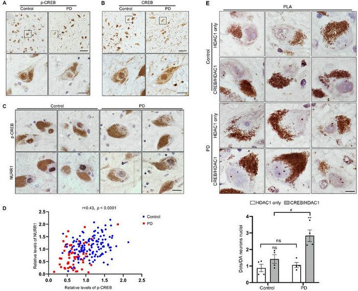 Figure 1. CREB inactivation by dephosphorylation at Ser133 (A-D) and increased interaction between CREB and HDAC1 (E) in the nigral dopaminergic neurons of PD patients