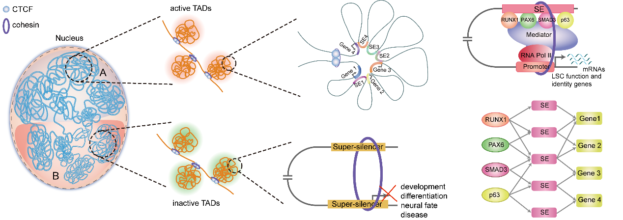 We construct super-enhancer (SE) interaction networks that regulate LSCfunction and identity. The identification of a cohort of intersected SE interaction hubs that contain multiple SE-SE and SE-promoter (SE-P) loops proposes a novel regulatory pattern of SEs. The active and inactive region-anchored interactions are associated with cohesion and largely occur within the cohesion-occupied CTCF-CTCF loop domains (Figure 3).