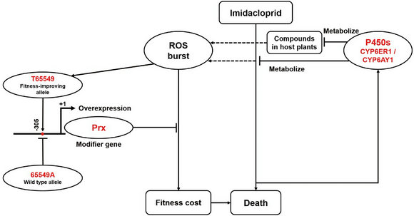 Subsequent results showed that overexpression of P450s not only confers imidacloprid resistance in Nilaparvata lugens, the most voracious pest of rice, but also leads to elevated production of reactive oxygen species (ROS) through metabolism of imidacloprid and host plant compounds. The inevitable production of ROS incurs a fitness cost to the pest. While N. lugens individuals carrying T65549 allele could upregulates the expression of NlPrx and thus increases resistant individuals’ ability to clear the cost-incurring ROS of any source (Figure 1). This represents the first functional characterization of such fitness costs-overcoming modifier genes/alleles of insecticide resistance. This pioneer study may prompt a study shift from focusing on Stage one to both stages of resistance evolution of pests to insecticides.