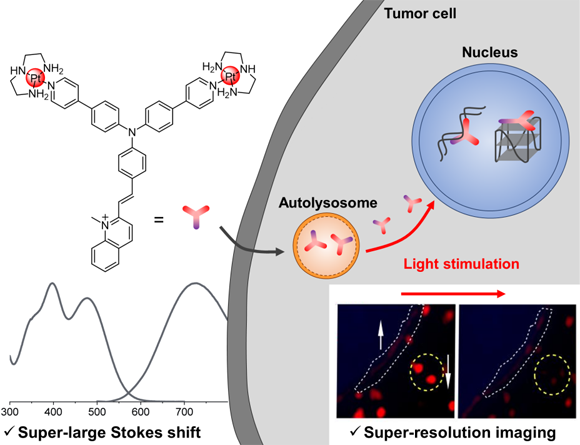 In recent years, great progress has been made in understanding the intracellular behavior of platinum drugs. However, the commonly used visualization of intracellular platinum drugs are currently all using confocal microscopy, and thus it is difficult to achieve dynamic tracking of ultrafine structure. Among different microscopies for cell imaging, super-resolution microscopy provides a super-resolution imaging technique to break the optical diffraction limit, and realizes the super-resolution monitoring of the dynamic changes of organelles and drugs screening. It is of great significance to track the platinum drugs in real time with super-resolution to elucidate their dynamic behavior in live cells for drug development. However, it remains a challenge to design small molecular compounds with excellent photophysical properties that can be used for super-resolution imaging.