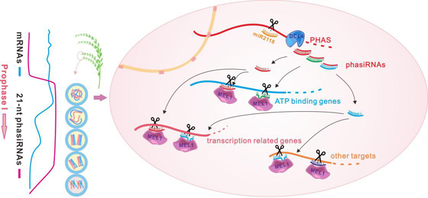 Recently, a study accomplished by Professor Yue-Qin Chen and Associate Professor Yu-Chan Zhang from School of Life Sciences at Sun Yat-sen University revealed that rice reproductive phasiRNAs are essential for the elimination of a specific set of RNAs during meiotic prophase I by combining multi-omics sequencing and functional analysis in a transgenic plant series. This study reported that AGO protein MEL1–phasiRNAs are essential for trans RNA cleavage and mRNA elimination during meiotic prophase I. These phasiRNAs cleave target mRNAs in a regulatory manner such that one phasiRNA can target more than one gene, and/or a single gene can be targeted by more than one phasiRNA to efficiently silence target genes (Figure 1). Investigation of phasiRNAs knockdown and PHAS-edited transgenic plants demonstrates that phasiRNAs and their nucleotide variations are required for meiosis progression and fertility. This study highlights the importance of reproductive phasiRNAs for the reprogramming of gene expression during meiotic progression and establishes a basis for future studies on the roles of phasiRNAs with a goal of crop improvement.
