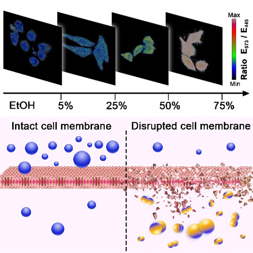 It is well known that the cell membrane controls the movement of substances in and out of cells. As the emission properties of Pt1 varied with the integrity of the cell membrane, its potential as a cell membrane integrity quantitative sensor was assessed. The research team verified that different concentrations of ethanol treatment can be used as a standard for cell membrane damage degree. Experimental results show that the blue emission intensity in all ethanol-treated cells remained unchanged while the yellow emission intensity was ethanol concentration-dependent, the ratio of yellow emission to blue emission can represent the damage degree of the cell membrane. The research team did more research and found out that Pt1 can be used not only to distinguish live cells, apoptosis, and necrosis but also to analyse the degree of cell membrane permeability during the process.