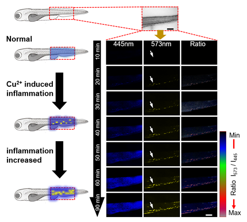 As acute inflammation is associated with the integrity of the plasma membrane, zebrafish larvae were exposed to CuSO4 (10 μM) followed by 5 μM of Pt1. As shown in Figure 3, located in the lateral line system of the larvae the complex forms yellow dots which gradually merge to form striations over time, indicating the presence of membrane damage. The ratio imaging results demonstrate that Pt1 can be applied to in situ real-time monitoring of the degree of membrane damage and to trace the inflammation process in vivo.
