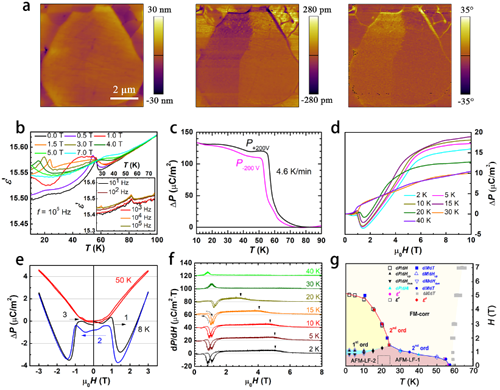 The magnetoelectric coupling results of HP-CTO are displayed in Fig. 3, showing an intrinsic anomalous peak in the dielectric constant at T2 ~ 58 K (Fig. 3b), below which the polarization intensity starts to increase. The electric polarization in HP-CTO cannot be switched as the direction of the applied poling electric field is reversed, therefore, the nature of HP-CTO is pyroelectric, rather than ferroelectric (Fig. 3c). HP-CTO exhibits the coupling effect of polarization and magnetic field derived from magnetostriction. The detailed magnetoelectric phase diagram of HP-CTO is plotted in Fig. 3 based on the magnetic and electrical results (Fig. 3g).