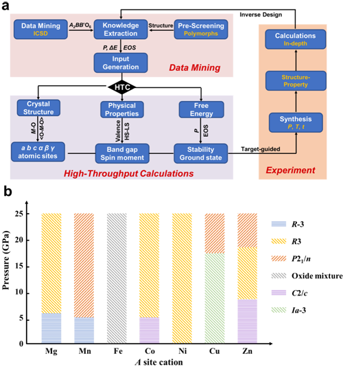 (a) The workflow of function-oriented searching (composition screening) and designing of new exotic A2BB’O6 materials via seamless integration of data-mining, HTC, and experiment.