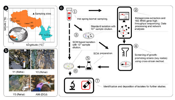 Fig. 1. Overview of the sampling sites and the workflow for the network-directed isolation procedure from HSMMs. (a) Location of the sampling sites; (b) Representative samples (Y1, Y2 and Y3 from Yunnan, and A96 from Tibet hot springs) that are used for isolation; (c) Workflow use to predict key-node taxa and screening for growth-promoting strains. SCM plate was effective in the isolation of targeted microorganisms from the HSMMs.