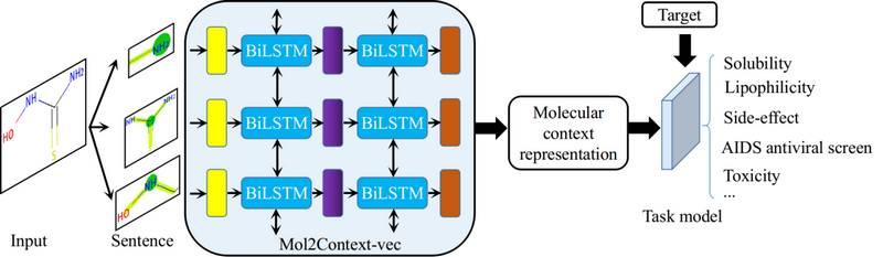 Recently, the team of Prof. Calvin Yu-Chian Chen from the School of Intelligent Systems Engineering, Sun Yat-sen University, published a research paper online entitled "Mol2Context-vec: learning molecular representation from context awareness for drug discovery" in the internationally renowned journal Briefings in Bioinformatics. This work proposed a novel deep contextualized bidirectional long short-term memory (Bi-LSTM) architecture, Mol2Context-vec, which can integrate different levels of internal states to bring abundant molecular structure information. And the obtained molecular context representation can capture the interactions between any atomic groups, especially a pair of atomic groups that are topologically distant.