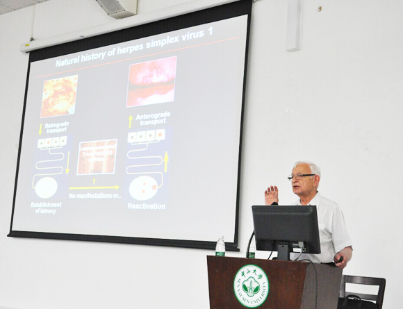 Prof. Roizman gave a lecture entitled “The Long Voyage in Search of the Right Questions”, talking about his journey of scientific research in the field of herpes simplex viruses over four decades. He shared his experience in discovering, analyzing and solving problems as well as training talents. After the lecture, Prof. Roizman answered questions raised by faculty and students and took a photo with them.