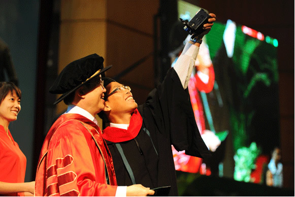 For the last time, warming up music plays; for the last time, truncheon enters the auditorium; for the last time, national anthem is sung; for the last time, Mr. Sun Yat-Sen’s precepts are read out;for the last time, cheers rise ; for the last time, trencher caps are thrown in the air;for the last time, school anthem rings in ears “Towering Baiyun Mountain, far-stretching Zhujiang River”; the last shot is given to the decorated graduation wall ; the last wish is written on the Message walls……, all these lasts tell us that the 2011 Commencement and Degree Awarding Ceremony is drawing to a close.