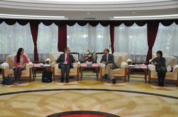 University of Warwick Vice President Lawrence Young (left) holds cooperation discussions with SYSU Vice President Li Mengfeng.