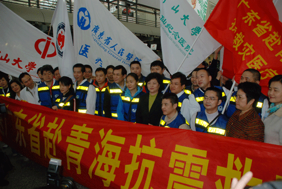 After the earthquake, SYSU recommended a medical team made up of 26 medical workers to the provincial Ministry of Health promptly. Among them, 8 medical workers jointed in “Guangdong Anti-Earthquake Rescue Medical Team for Qinghai” organized by the Guangdong Ministry of Health and took off from Baiyun Airport at 7 o’clock this morning, flying to the disaster area for rescue work. The 8 medical workers are Xu Xiangdong from the department of vascular surgery, Chen Chao from the department of chest surgery, Li Yujie from the department of emergency internal medicine, Zheng Xunhua from the department of nephrology of the first Affiliated Hospital as well as Liu Anmin from the department of cerebral surgery of Sun Yat-sen Memorial Hospital, Li Jianguo & Shu Xin from the department of infectious disease, and Ou Qinglan from the department spinal surgery of the third Affiliated Hospital. Lei Yulan, vice-governor of Guangdong Province, Huang Xiaolin, secretary of Party Leadership Group of the Ministry of Health and Wang Jianping, vice president of SYSU went to the airport to see the medical team off, expecting them to return with victory in healing the wounded and rescuing the dying in spirit of arduous struggle and cooperation.