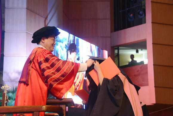 When He Jinghui, a M.A. student from Department of History, was shaking hands with the President, her graduation cap fell off. She picked it up in embarrassment. The President helped her put on the graduation cap.
