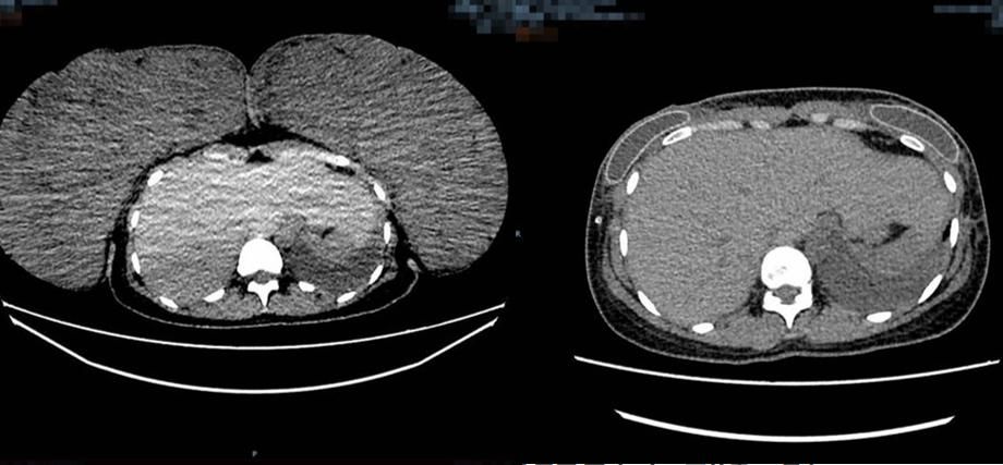 Comparison of the patient's chest enhancement CT. Preoperative size (left): 267 mm×100 mm×293 mm, postoperative size (right): 125 mm×270 mm×340 mm.