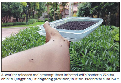"Since the project started in May, about 80 percent of female mosquitoes in the (experimental) area have been eliminated," said Qian Wei, deputy general manager of Guangzhou Wolbaki Biotech Co, the company that helped the community to successfully combat the menace.