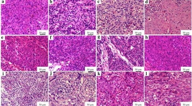 NPC generally exhibits the following pathomorphologies: epithelial carcinoma: small round, oval or cobblestone-like tumor cells, low nucleus to cytoplasm ratio or chromatin-rich cells, ambiguous boundaries between large round cells, centered nucleoli, large and round vesicle-like nuclei, and a nucleolar occupancy in tumor cells of more than 75%; sarcoma-like carcinoma: small irregular cells, large cells with darker chromatin, uniform medium-sized spindle cells with unobvious nucleoli, or tumor cells with darker nuclei and eosinophilic cytoplasm; mixed carcinoma: the characteristics of both epithelial carcinoma and sarcoma-like carcinoma; squamous cell carcinoma: well-differentiated keratinizing squamous cell carcinoma with obvious intercellular bridges and horny pearls, and poorly differentiated or intermediately differentiated squamous cell carcinoma interspersed with a small number of basal-like cells.