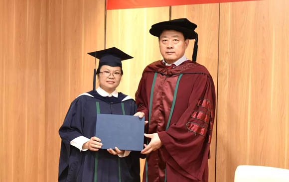 Dean Huang Xinfei presenting the degree certificate to the graduate
