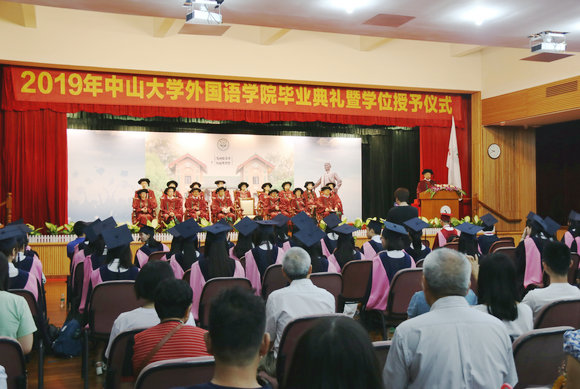 On the morning of June 26, the School of Foreign Languages held the 2019 postgraduate graduation ceremony and the degree ceremony in the Ip Po-ting Hall on Guangzhou South Campus. The School’s Dean Wang Dongfeng, Secretary Huang Shan, Deputy Secretary Si Fei, supervisor representatives, the 2019 graduates and their friends and relatives attend the ceremony. Assistant Dean Jin Tan presided over the ceremony.