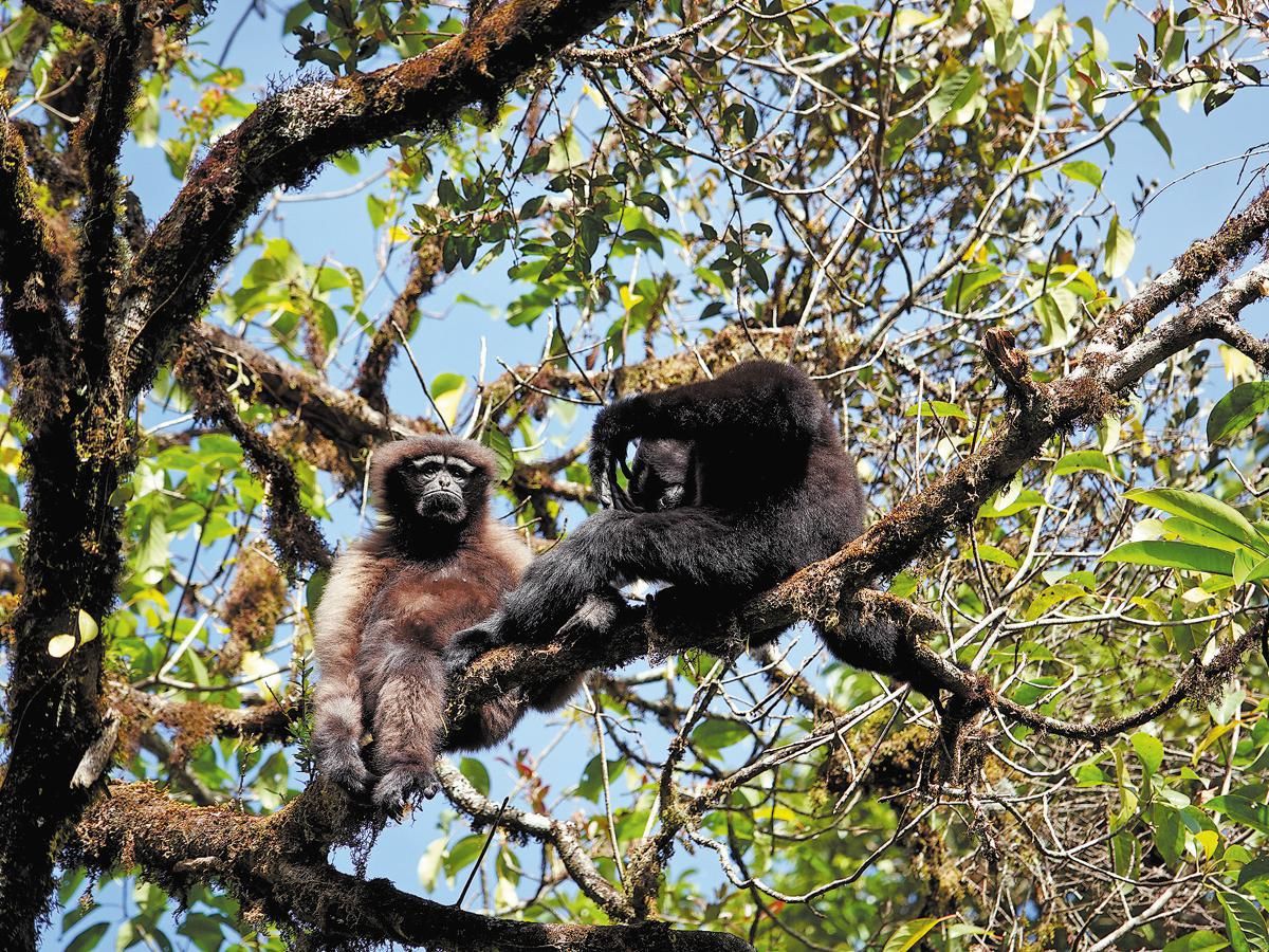 Two Skywalker hoolock gibbons rest on the canopy of a collective forest in Baoshan. ZHU CHANGYUE/FOR CHINA DAILY