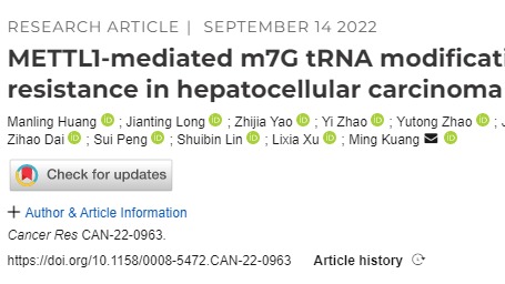 Recently, Prof. Ming Kuang's research team from the First Affiliated Hospital, Sun Yat-sen University published a research paper entitled “METTL1-mediated m7G tRNA modification promotes lenvatinib resistance in hepatocellular carcinoma” online in Cancer Research, which deciphered novel mechanisms underlying lenvatinib resistance from a translation level perspective.
