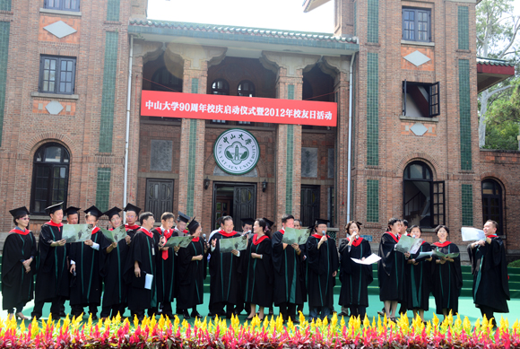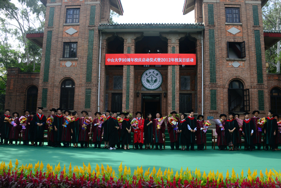 On November 10th, a sunny and warm day, Honglok Campus was imbued with laughter everywhere. On the Great Central Lawn in front of the Swasey Hall, more than 1,600 alumni who were admitted into SYSU in 1977, 1978, 1982 and 1988, were wearing the special-made academic robes and having a special "degree ceremony". It is not only the scene of 2012 Alumni Reunion Day, but also the official launching of the 90th anniversary celebrations of Sun Yat-sen University.