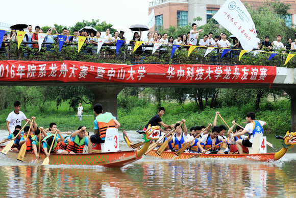 On May 14, 2016, the SYSU Dragon Boat Racing was held on the East Campus of Sun Yat-sen University (SYSU). 41 teams (16 women’s teams and 25 men’s teams) from 13 schools and departments participated in the racing. The organizer also invited two guest teams: the SYSU alumni dragon boat racing team, and the dragon boat racing team of Huazhong University of Science and Technology (HUST).
