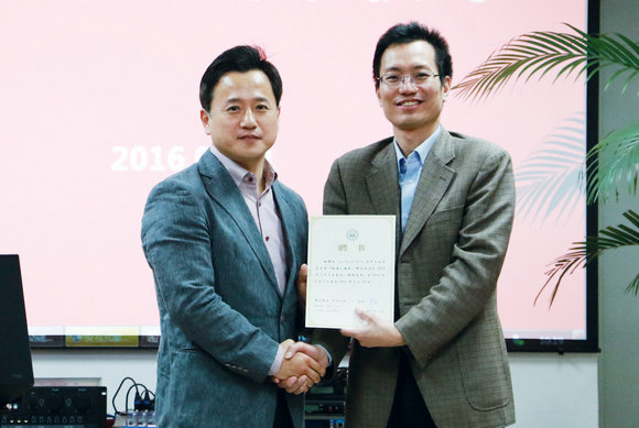 Prof. Chen Jianhong (right) presenting the letter of appointment to Prof. Jun-Hyeok Kwak (left)