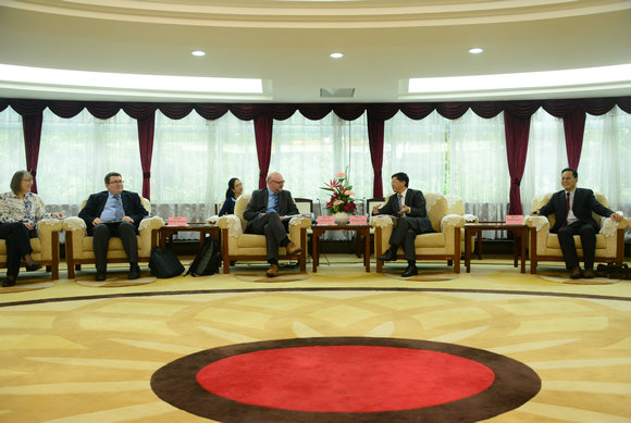 On the afternoon of March 20, 2015, a delegation led by Mr. Lee Sanders, Registrar of University of Birmingham (UoB), visited SYSU. Members of the UoB delegation also included Prof. Richard Williams OBE, Pro-Vice-Chancellor and Head of College of Engineering and Physical Sciences, and Prof. Myra Nimmo, Pro-Vice Chancellor and Head of College, Life and Environmental Sciences. Prof. Wei Minghai, Vice President of Sun Yat-sen University (SYSU), met with the guests, accompanied by Prof. Qiu Rongliang, Dean of School of Environmental Science and Engineering, Prof. Gao Dingguo, Head of Department of Psychology, and Ms. Xu Yao, Deputy Director of Office of International Cooperation and Exchange.